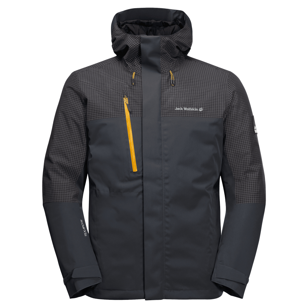 - TEXAPORE ECOSPHERE BIG GRID 2L (ТЭКСАПОР ЭКОСФИА БИГ ГРИД 2Эль): водо- и ветронепроницаемая, превосходно дышащая наружная ткань, изготовленная из переработанного сырья (водостойкость в мм водного столба: 20 000 мм*, паропроницаемость (MVTR): > 15 000 г/м²/24ч**) (метод испытания: * JIS L 1092; ** JIS L 1099 B-1) (плечи и верхняя часть рукавов) подкладка из микрофибры, изготовленной из переработанного сырья, с принтом в виде логотипа