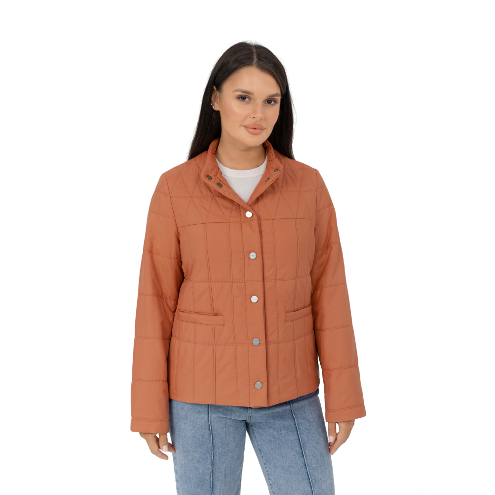 Сочетание геометрической стежки разных дизайнов, невысокий воротник-стойка, 2 внешних кармана на кнопке и 1 внутренний на молнии.