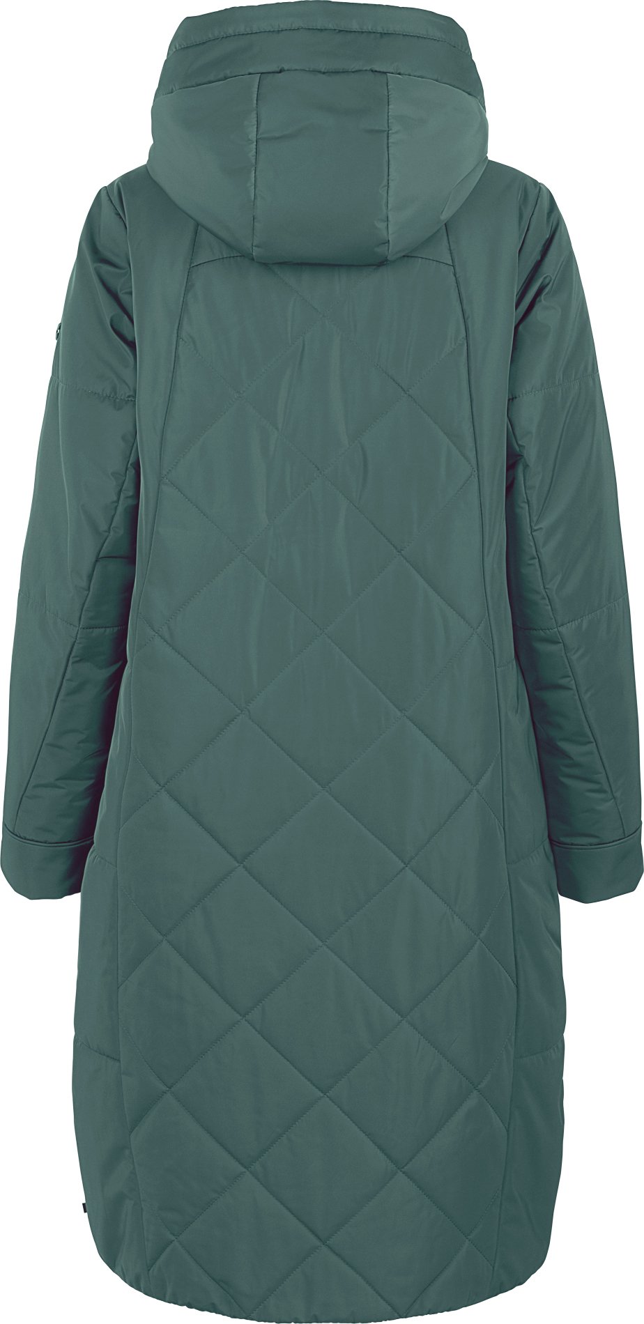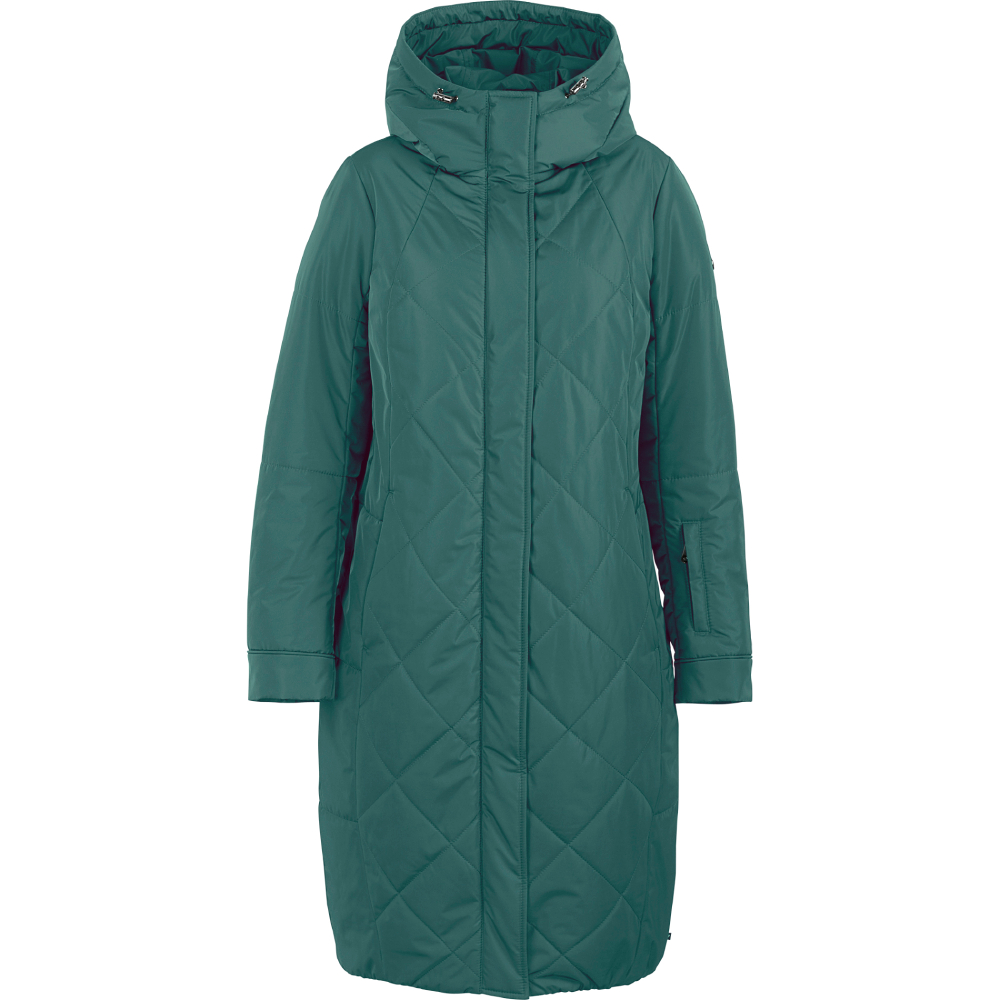 Пальто средней длины из мембранной ткани с выраженным блеском. Плавные и чуть расходящиеся к низу рельефы дополняют лаконичный прямой силуэт. Крупная горизонтальная стежка в совокупности с ромбовидной стежкой по центру изделия создают запоминающийся внешний облик модели. У пальто мягкий несъемный капюшон и минимум фурнитуры.