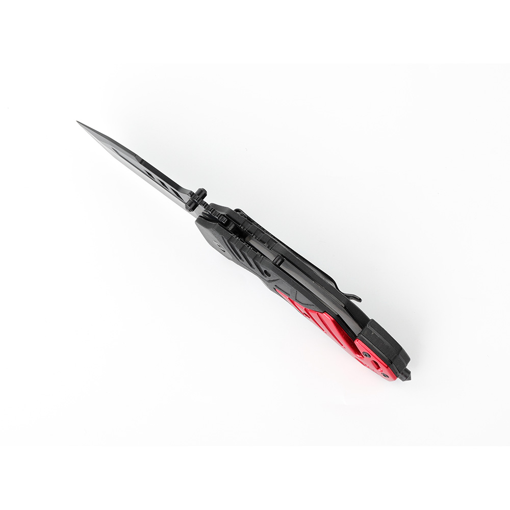 Рукоять изготовлена из комбинации полипропилена, армированного стекловолокном и алюминия, благодаря чему она легкая, прочная и устойчивая к механическим повреждениям. Это синтетический материал, который обладает рядом полезных свойств, таких как высокая прочность, устойчивость к износу и воздействию химических веществ, а также легкий вес. Черно-красная расцветка придает ножу стильный узнаваемый внешний вид.