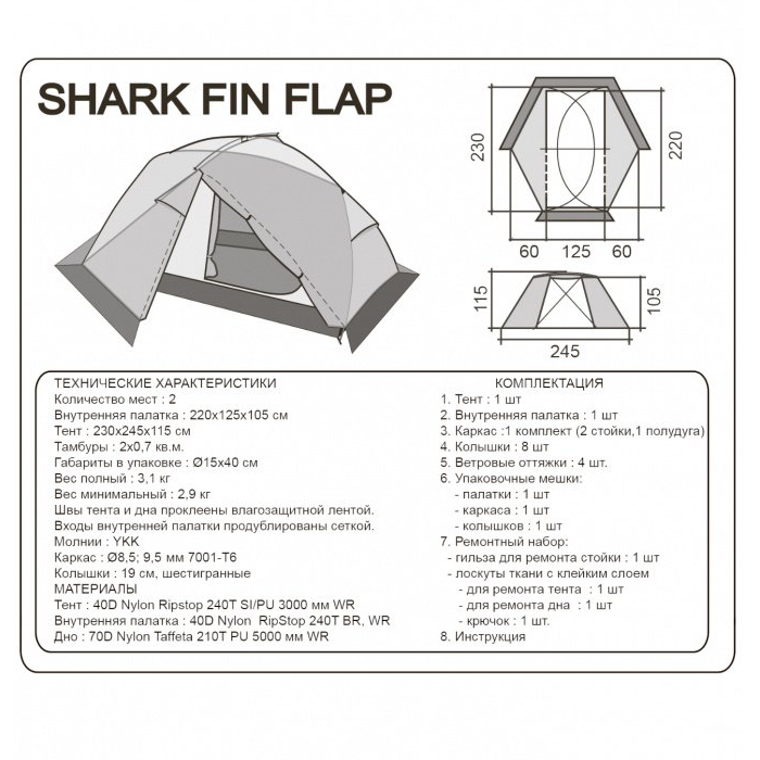 - Материал внешнего тента: 40D Nylon Ripstop 240T SI/PU 3000 мм WR