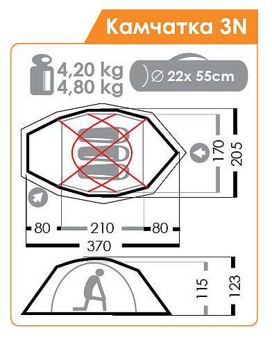 - Габаритные размеры внутренней палатки (l x b x h), см 210 х 170 х 115