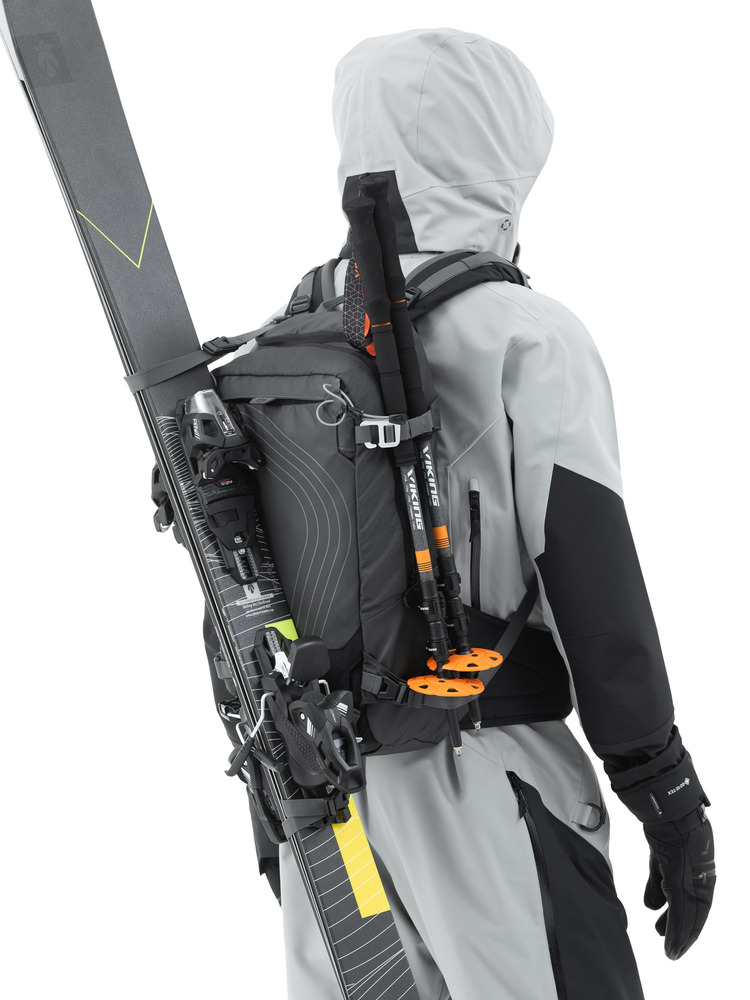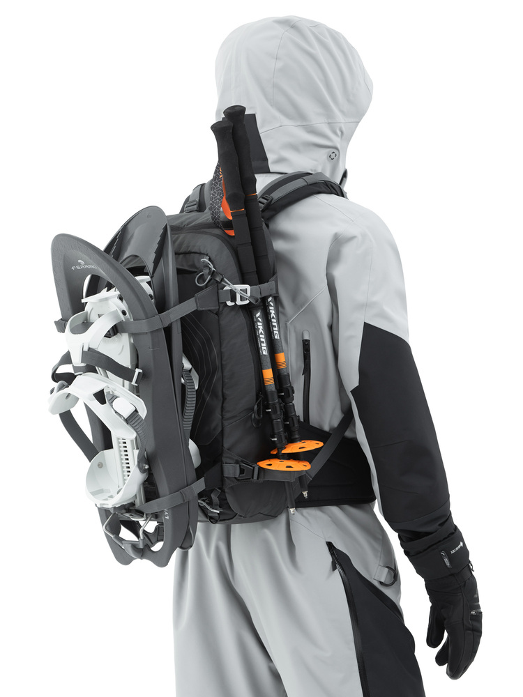- Универсальная система крепления снаряжения предусматривает боковые A-образные и диагональные крепления для горных лыж или разобранного сплитборда. Фронтальные крепления подходят для сноуборда и снегоступов в вертикальном положении. Все фиксаторы оснащены регулировкой, благодаря чему снаряжение надёжно фиксируется и не мешает движению.